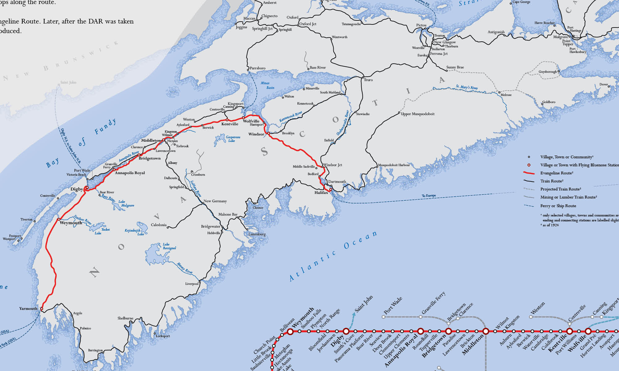 Instead of labeling all stations along the Evangeline Route, a separate, schematic map with all stations is
