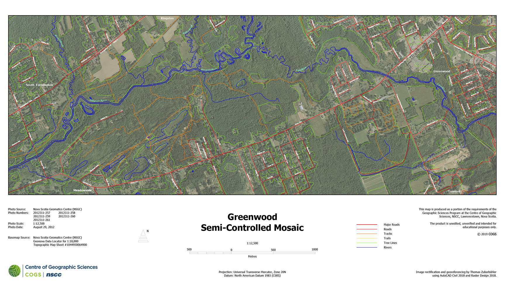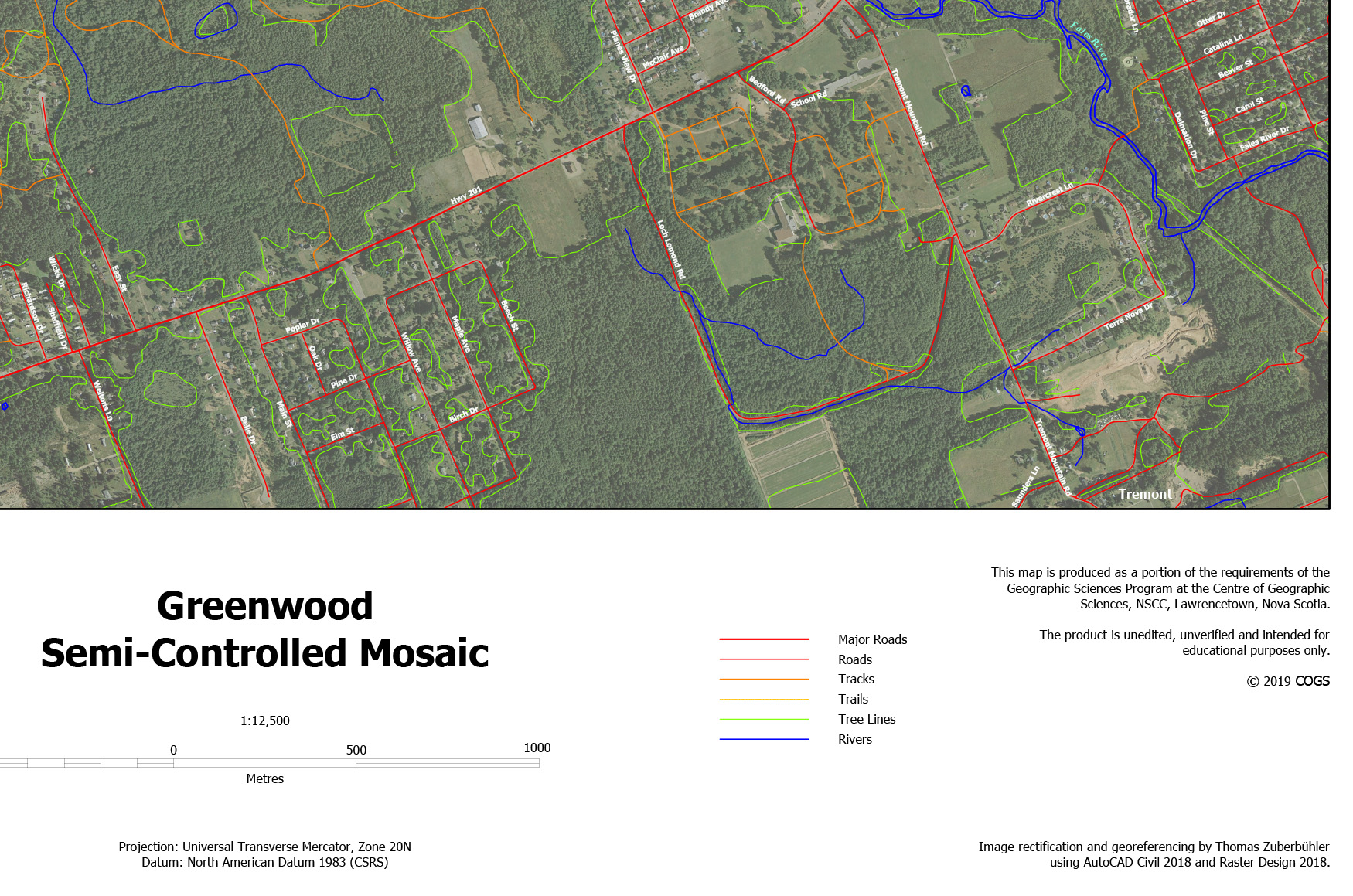 Provided with 4 orthophotos (Nova Scotia Geomatics Centre (NSGC)) and a DFX file with streets and rivers (from GeoNOVA Data Locator, NSGC), this assignment's goal was to rectify and georeference those orthophotos with AutoCAD Civil 3D 2018 and AutoCAD Raster Design 2018.